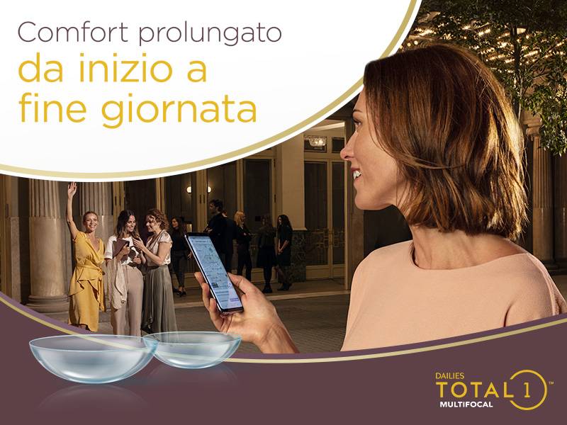 Le lenti a contatto Dailies Total1® Multifocal foniscono un'idratazione a lunga durata per il piacere di indossarle anche fino a tarda notte8. Sono destinate per tutti coloro che hanno bisogno di una correzione della vista in caso di presbiopia, per una vista nitida da vicino e da lontano1,3,4. Sono adatte a tutti quegli utenti che hanno problemi di secchezza oculare e desiderano una lente comoda che non si sente nemmeno durante l'uso1.